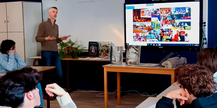 Les élèves de PGD ont, quant à eux, échangé avec Lomig autour de son œuvre Dans la forêt, une très belle adaptation du roman à succès de Jean Hegland. Ils ont notamment questionné l’évolution de la relation entre les personnages et la forêt. La classe avait découvert en amont cette magnifique bande dessinée dans le cadre d’un arpentage proposé par Madame Didier, leur professeure de français, et Madame Bellego, professeure documentaliste.